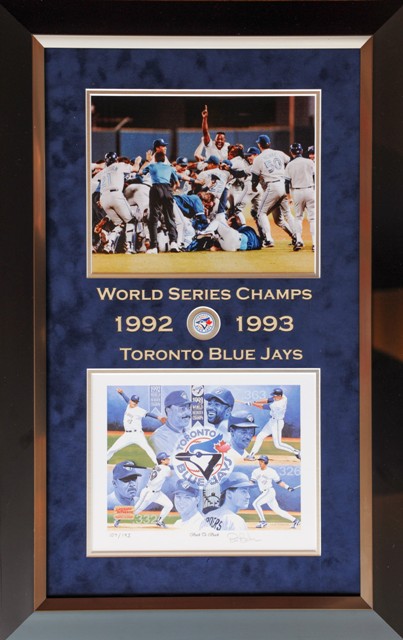 This limited edition lithograph is presented in double frame with the team celebration photograph. This item is numbered out of the 93 that exist and hand autographed by Pat Borders 1992 World Series MVP. The item is museum framed with blue suede matting and hand signed comes with a Certificate of Authenticity and Hologram. . Own this Piece of Blue Jays History!
