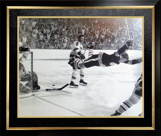 This framed 11 x 14 in. photograph features the most famous moment in hockey histroy; Bobby Orr flying through the air scoring the overtime 1970 Stanley Cup winning goal of Boston Bruins.