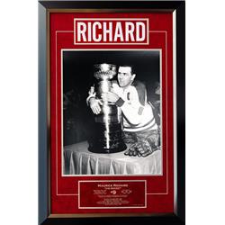 Maurice "Rocket" Richard is featured in this rare collectable and exclusive limited edition of only 199! A Richard jersey name from a Montreal Canadiens jersey is framed with a photo of Maurice Richard. This item comes museum framed with Hologram measures 24x28 inches. Own this piece of Hockey History!