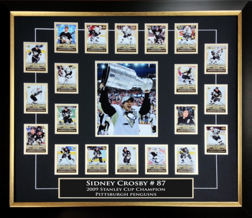 Sidney Crosbys rookie card set Phenomenal Beginning by Upper Deck museum framed with a collector photo depicting Sidney Crosby holding his first Stanley Cup. This item comes museum framed. A must have for any hockey fan! This item is 32 x 26 inches; n