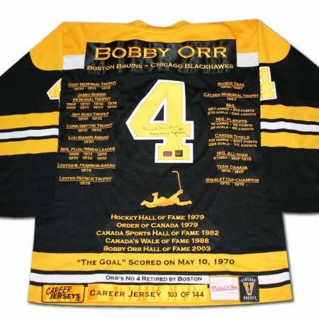 The Bobby Orr Career Jersey is an autographed limited edition jersey very rare and a great investment. The jersey is embroidered with the accomplishments that highlighted his legendary career and numbered out of the 144 that exist. It comes with a Cert