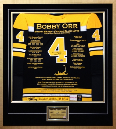 The Bobby Orr Elite Edition Career Jersey is an autographed limited edition jersey very rare and a great investment. The jersey is embroidered with the accomplishments that highlighted his legendary career displayed in a high end museum framed presenta