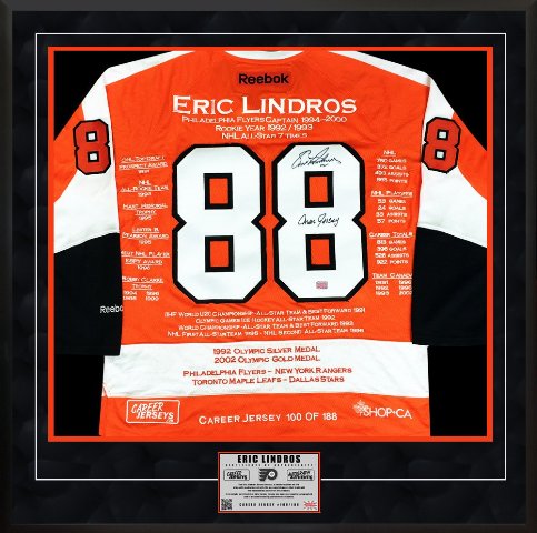 The Eric Lindros Career Jersey is an autographed limited edition jersey very rare and a great investment. The jersey is embroidered with the accomplishments that highlighted his memorable career and numbered out of the 188 that exist. It comes with a Certificate of Authenticity matching the edition number and guaranteeing the autograph. Do not miss this opportunity to own a true piece of Hockey History.