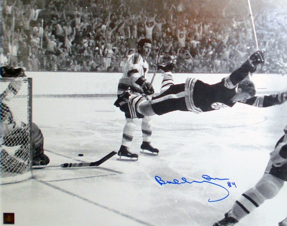 This 16 x 20 photograph features the most famous moment in hockey history; Bobby Orr flying through the air scoring the overtime 1970 Stanley Cup winning goal. The photo is hand autographed comes with GNR and AA Hologram and Certificates of Authenticity.