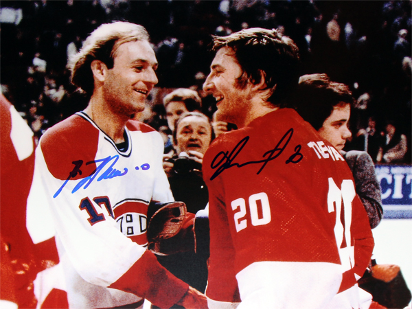 In this 8x10 Guy Lafleur and Vladislav Tretiak are shaking hands in the 1976 Summit Series. The photo is hand autographed comes as shown with Hologram and Certificate of Authenticity.