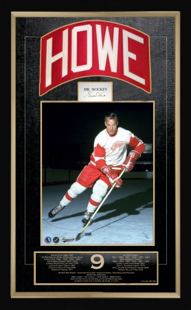 Gordie Howe Mr. Hockey is featured in the awesome collectable. A Howe jersey name from a Detroit Red Wings jersey is museum framed with an 11 x 14 photo of Howe and a hand inscribed Cut Signature titles Mr. Hockey. This item comes museum framed with certificate of authentiticy.