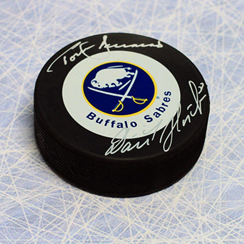 Autograph Authentic HASD113053 Dominik Hasek and Tom Barrasso Dual Signed Buffalo Sabres Vezina Winners Puck
