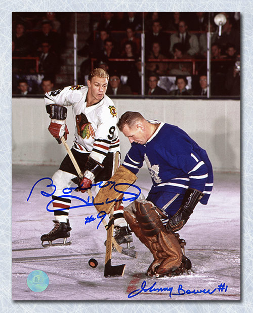 Autograph Authentic HULL101031 Bobby Hull vs Johnny Bower Dual Signed Original Six Legends 16 x 20 in. Photo