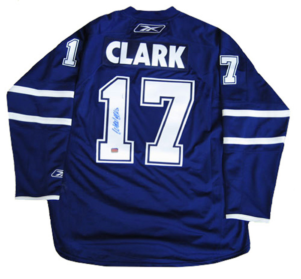 A Toronto Maple Leafs and NHL favourite Wendel Clark has hand autographed this jersey. The jersey is semi-pro with name and numbers professionally sown on. A must have for all hockey fans!