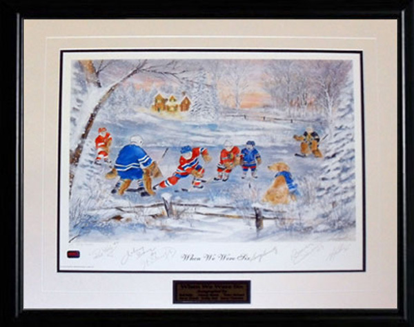 This item is titled When We Were Six and is a limited edition and numbered of 2001. The lithograph is signed by six Hockey Hall of Fame players one from each of the Original Six teams; Red Kelly Harry Howell Johnny Bower Bobby Hull Henri Richard G