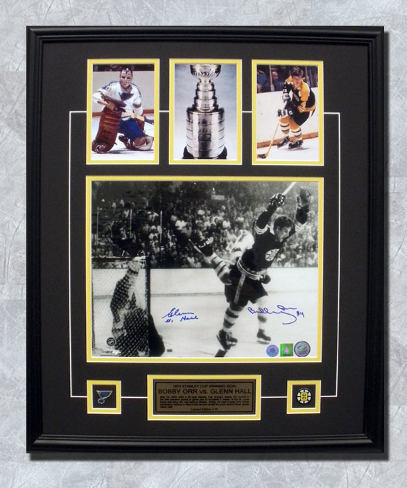 Autograph Authentic ORRB10236A Bobby Orr vs Glenn Hall Dual Signed Stanley Cup Goal 27 x 23 in.Frame LE Number - 70