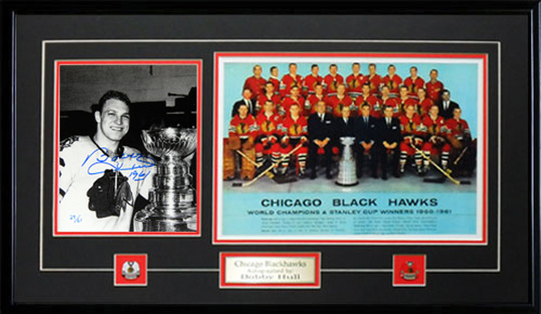 This double photo features Bobby Hull with his 1961 Stanley Cup & the 1961 Chicago Blackhawks Stanley Cup champions. A limited edition numbered out of 61 in existence. The item is hand signed and museum framed. This item measures 24 x 15 inches; not inc