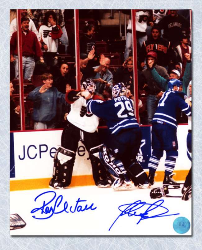 Autograph Authentic POTF10404B Felix Potvin and Ron Hextall Dual Signed Leafs Flyers Goalie Fight 11 x 14 in. Photo