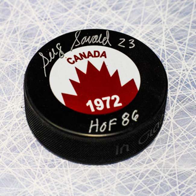Autograph Authentic SAVS99705A Serge Savard Team Canada Autographed 1972 Summit Series Hockey Puck with HOF Note